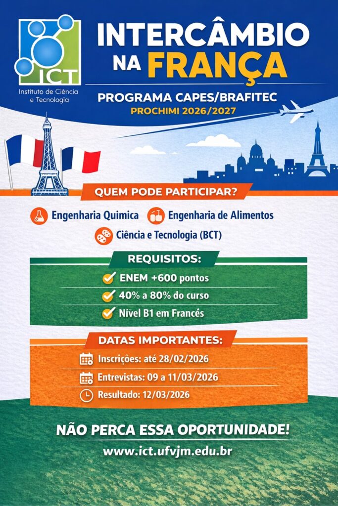 O Instituto de Ciência e Tecnologia (ICT/UFVJM) divulga o Edital CAPES/BRAFITEC – Projeto ProChimi (Edição 2026/2027), que trata da seleção de estudantes de graduação para participação em intercâmbio acadêmico em instituições francesas de excelência, com bolsas financiadas pela CAPES.